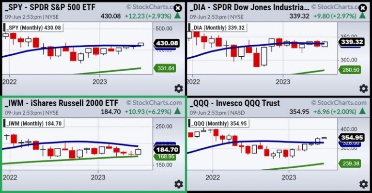 Looking at the monthly charts of the four major indices as we hit mid-June, all but the Russell 2000 are trading above their 23-month moving average. Thus far, this is in line with our prediction that, by the time IWM hits (if it does hit) 190-200 and the SPY hits 440, the top will be in.