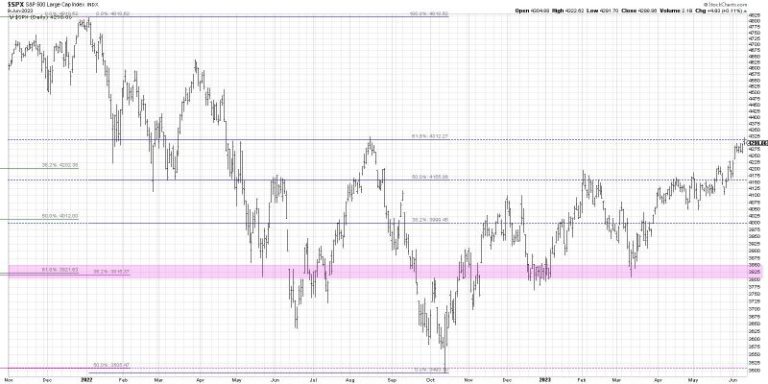 If we consider the 2022 bear market phase as the framework for a Fibonacci analysis, we come up with three important levels to watch. First, the 38.2% retracement level hits right around 4000, which was first reached in November and preceded the drop down to the December low around 3800. Second, the 50% level is right around 4155, which was pretty much where the February 2023 high ended up; note how many times we tested this level during the congestion phase in April and May!