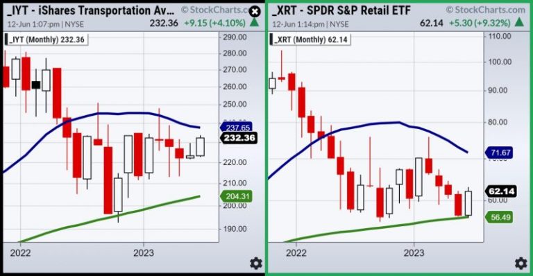 S&P 500 (SPY): We took out the August 2022 high 431.73 — now must hold.Russell 2000 (IWM): 180 — now must hold while still miles from its 23-month MA of 193.Dow (DIA): 23-month MA 337 cleared, 340 next big level.Nasdaq (QQQ): Do we hear 370?Regional Banks (KRE): Red today and yet holding, 42.00 now support.Semiconductors (SMH): 151.71; if clears probably means another leg higher.Transportation (IYT): 237 area the 23-month moving average.Biotechnology (IBB): 121-135 range.Retail (XRT): 60 now support and 63 resistance.