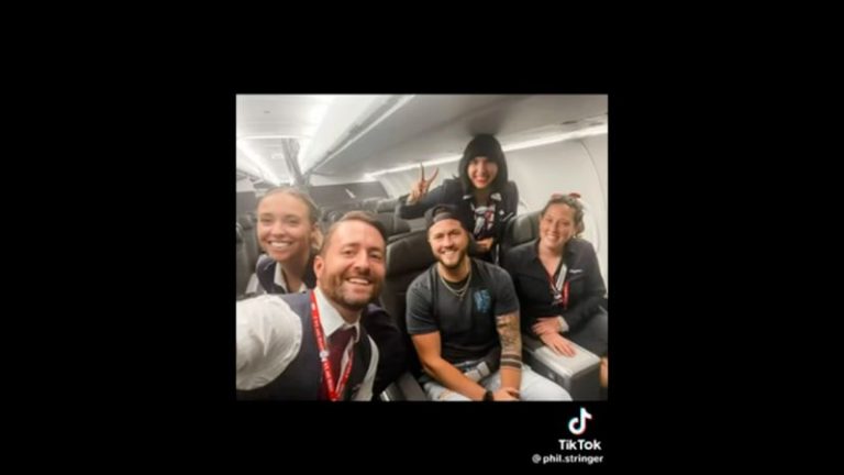 He filmed a baggage handler confirming he’d only loaded a single bag onto the flight, a giggling gate agent announcing boarding to rows of empty seats, and a jaunty personal safety demonstration from the flight attendants, who didn’t seem as angry about being called to work at midnight as they might.