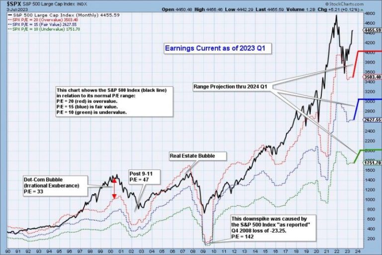 The following chart shows the normal value range of the S&P 500 Index, indicating where the S&P 500 would have to be in order to have an overvalued P/E of 20 (red line), a fairly valued P/E of 15 (blue line), or an undervalued P/E of 10 (green line). Annotations on the right side of the chart show where the range is projected to be based upon earnings estimates through 2024 Q1.