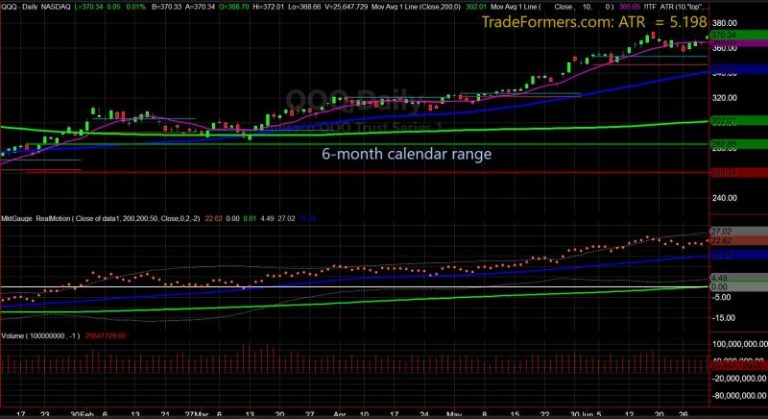 One of the most interesting things about July in the market is the biannual reset of the 6-month calendar range. Above is a chart of the NASDAQ 100, with the January 6-month calendar range drawn in. (To clarify, it is the solid green line that goes perfectly horizontal across the screen.)