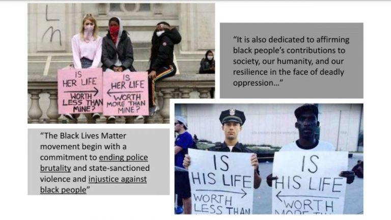 A separate presentation appeared to promote BLM by including a depiction of a White police officer holding a sign pointing to a Black man that asked, ‘Is his life worth less than mine?’ Another image showed a White woman holding a similar sign toward a Black woman. Other slides depicted alleged police brutality towards Black Americans.