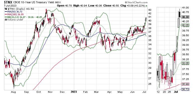 Note the yield closed above the upper Bollinger Band, which means it is overextended. The RSI is also near 70, signaling an overbought condition and confirming that a reversal is in order. In addition, since all price gaps are eventually filled, such as the one between 3.95% and 4% in this chart, we may see TNX retrace its steps back to 3.95% or even to the 20-day moving average. If that happens, I would expect one last move up by stocks before the Fed meets on 7/25-26.