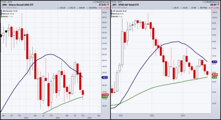 The first chart is the monthly charts of small caps and retail (IWM and XRT). The 80-month moving average (green line) is a longer-term business cycle or about 6-7 years. Besides the blip during COVID, IWM has not broken that 80-month MA since 2010. XRT sits right above the 80-month. To remain bullish, those lines must continue to hold.