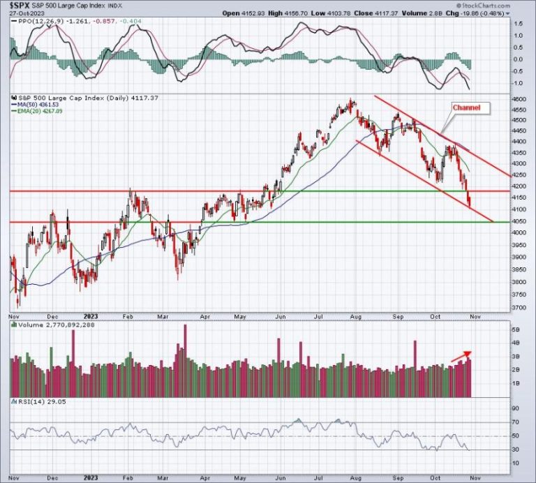Well, a Fed pause in hiking rates combined with falling inflation and rising GDP, could be a catalyst to much higher U.S. equity prices in the weeks and months ahead. That’s speculation, however, and we must see the technical conditions of our key indices change for the better. While the soft landing proponents may grow in confidence after last week’s GDP, that same confidence has yet to appear in the charts. Here’s the S&P 500’s daily chart for the past year: