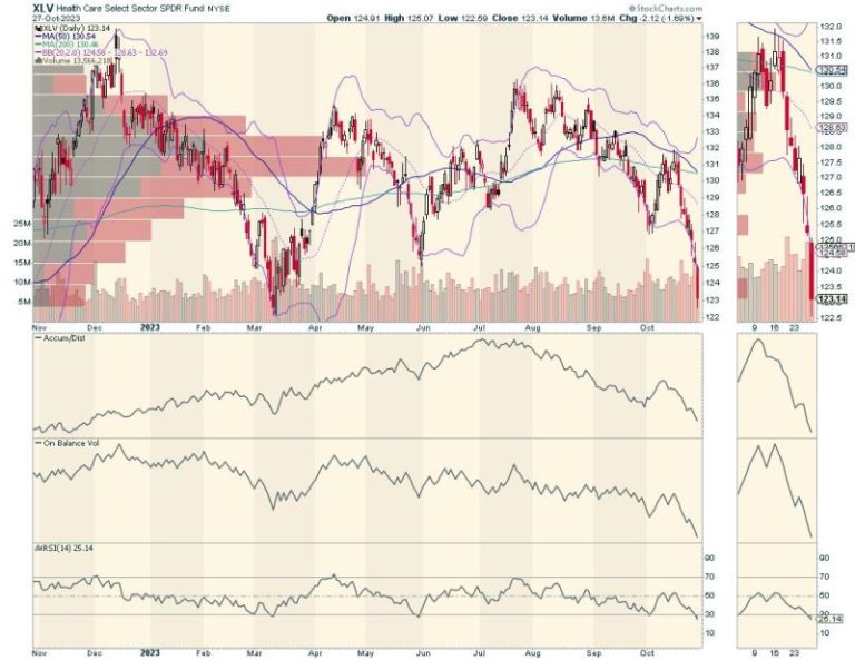 Investors are facing the potential for a reduction in income for care providers. Check out the action in the Healthcare Select Sector SPDR Fund (XLV), where short sellers (falling ADI) are jumping for joy, while buyers are just plain jumping off the train (crashing OBV).