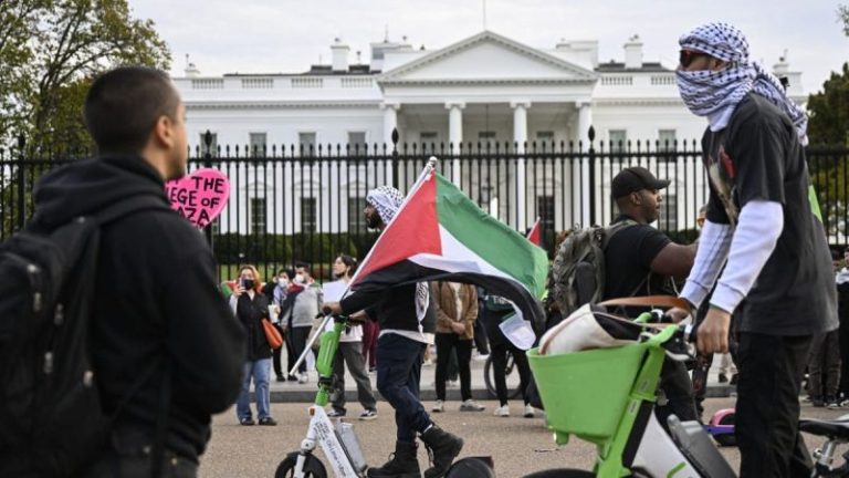 Protesters could be seen vandalizing the White House fence and wrenching at the gate as antisemitic graffiti was left on several buildings along the protesters’ path through the city.