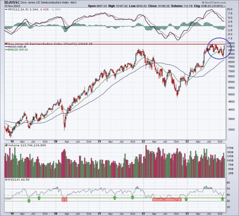 It was another very solid day on Friday, this time with the S&P 500 powering above 4400 and the NASDAQ 100 busting back above 15500, both clearing key price resistance levels that effectively end the series of lower highs and lower lows from the July high. The best news of all is that growth continues to be the driver behind market strength. On Friday, the Dow Jones U.S. Semiconductor Index ($DJUSSC) jumped another 3.7%, rapidly approaching the July and all-time high of 10430. The DJUSSC needs only another 2.6% gain to break to yet another all-time high: