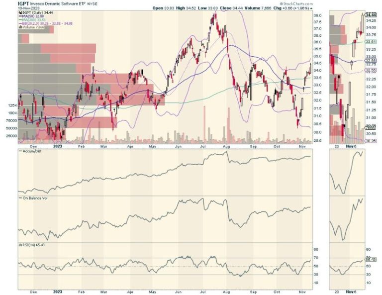 One such ETF is the Invesco Dynamic Software ETF (IGPT), recently renamed Invesco AI and Next Gen Software ETF, which is closing in on what could be a major breakout. But don’t let the title fool you; this ETF holds the usual large-cap tech stocks that typically rally when the tech sector moves into a rising trend, such as what is currently developing and is evident in the price chart for the Invesco QQQ Trust ETF (QQQ). QQQ holds many of the same companies, but currently trades at ten times the price of IGPT.