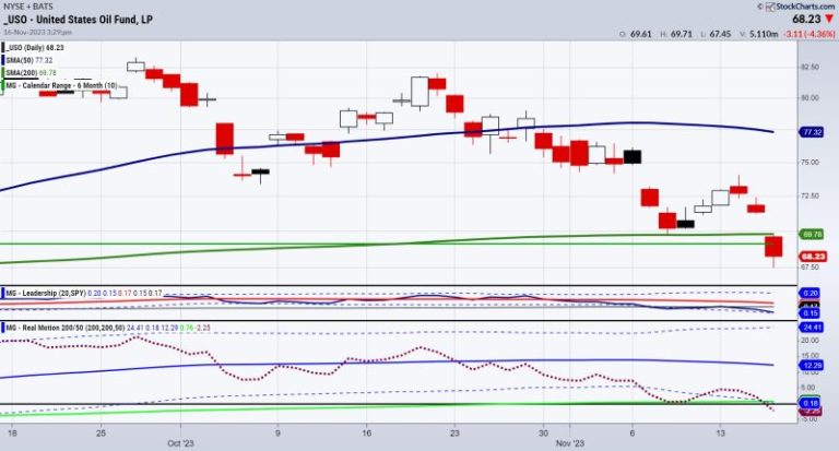 The futures contract (December) looks oversold and into support at $72.00 per barrel. The USO ETF chart just broke the July 6-month calendar range high (horizontal green line) and is looking oversold. More importantly, 67 is huge support so we are close if not at the bottom.