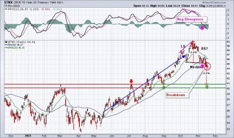 The 10-year treasury yield ($TNX), and its recent decline, is certainly aiding, at least in part, the recent surge in U.S. equities. After hitting 5.0% on October 23rd, the TNX has been in a steady decline. As I see it, we’ve got further downside in the yield based on the confirmation of a head & shoulders top: