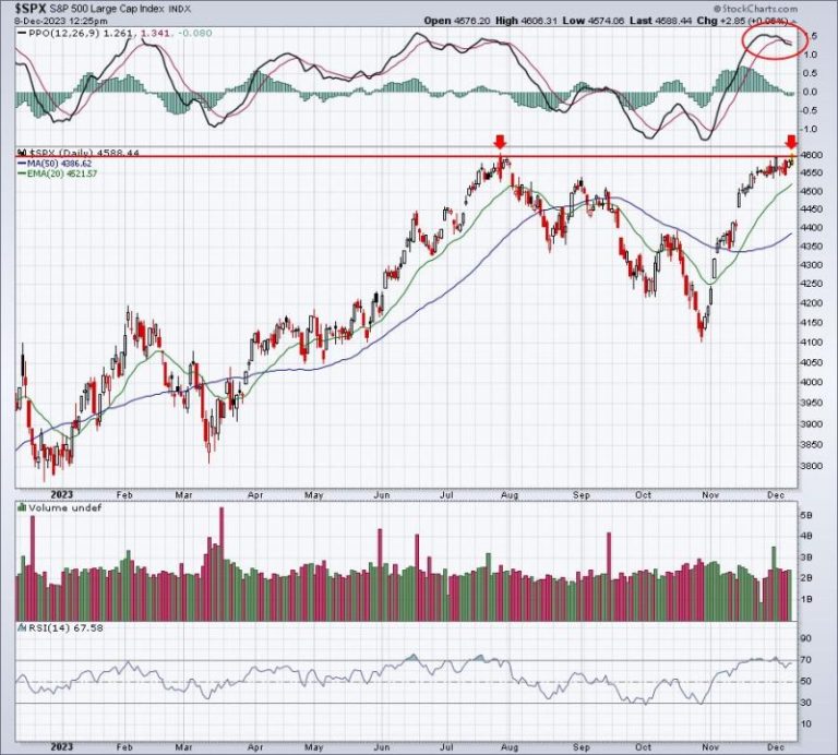 At the time of this writing, the S&P 500 is a dozen points away from this key level, with an earlier high above 4600. A false breakout on the close today, accompanied by that daily PPO rolling over isn’t a great look and combination, knowing how important this breakout would. But even a breakout doesn’t exactly suggest it’s an all-clear-ahead signal. That PPO is suggesting momentum is seriously slowing right now. If we do see a breakout, then be on the lookout for a reversing candle at some point next week. That very well could precede a bout of selling, perhaps as much as 3-5%.