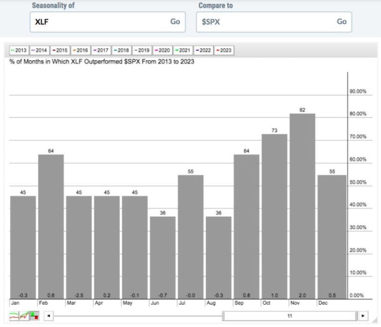 Industrials (XLI) aren’t much different, though their strength is clearly found in November. Here’s that same 11-year relative seasonality chart since 2013, but this time featuring the XLI: