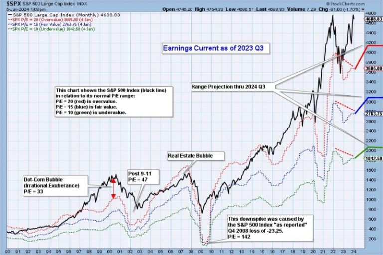 We use GAAP earnings as the basis for our analysis. The table below shows earnings projections through September 2024. Keep in mind that the P/E estimates are calculated based upon the S&P 500 close as of December 29, 2023. They will change daily depending on where the market goes from here. It is notable that the P/E is outside the normal range.