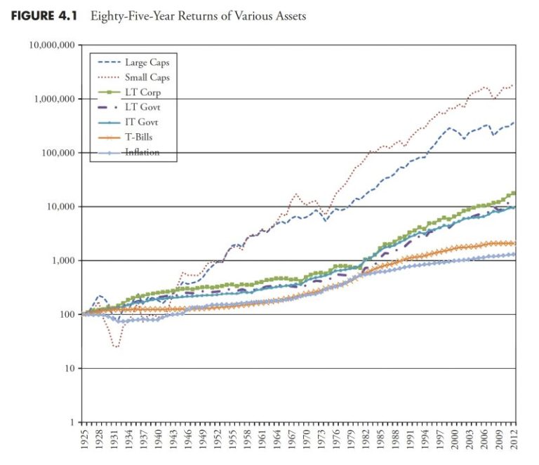 Table 4.1 shows the performance numbers for the asset classes shown in Figure 4.1 (LT—Long Term, IT—Intermediate Term). The cumulative numbers in Table 4.1 begin at 1 on December 31, 1925.