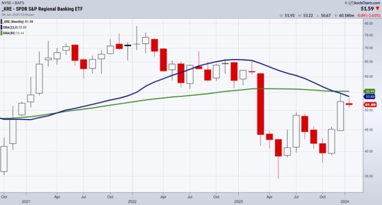 On the monthly chart, 54.00-55.50 is major resistance using the 23-month moving average (blue) and the 80-month MA (green). That price level also corresponds to the “scene of the crime” from last March. Ideally, bulls should feel safer in all the bank stocks if KRE can clear that resistance. And we don’t want to see KRE fail 50.00 once earnings are reported.